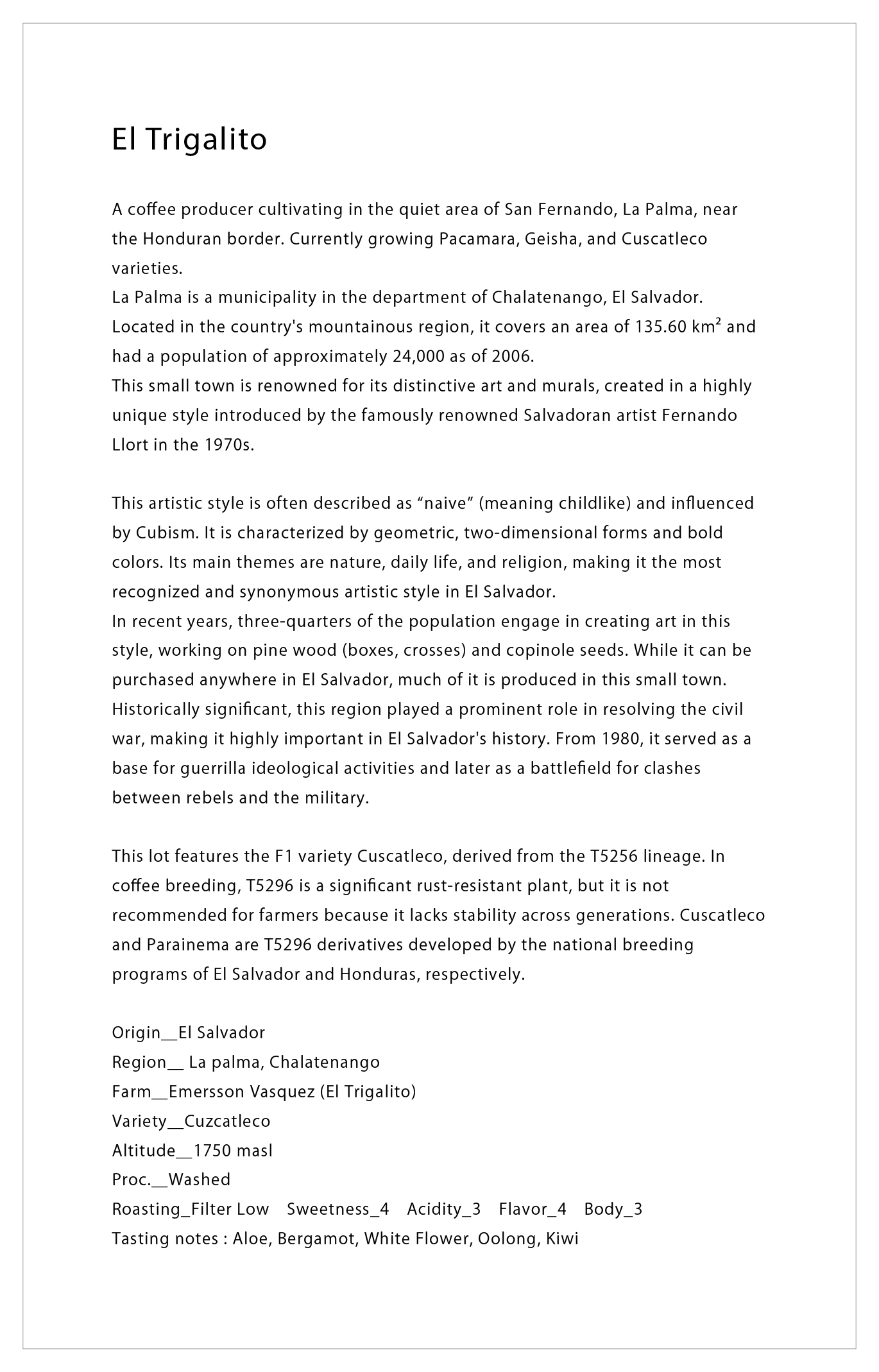 This lot features the F1 variety Cuscatleco, derived from the T5256 lineage. In coffee breeding, T5296 is a significant rust-resistant plant, but it is not recommended for farmers because it lacks stability across generations. Cuscatleco and Parainema are T5296 derivatives developed by the national breeding programs of El Salvador and Honduras, respectively. Furthermore, many new F1 hybrid varieties were created by crossing T5296 with Ethiopian landraces (examples include Centroamericano, Milenio, and Mundo Maya). T5296 originated in the early days of the Central American regional consortium “PROMECAFE,” established in 1978 with funding from USAID’s Regional Office for Central America Program (ROCAP) and Brazil’s Instituto Agronômico de Campinas (IAC). This consortium was formed to address the threat posed by the recent arrival of coffee leaf rust in the region.Origin_El Salvador