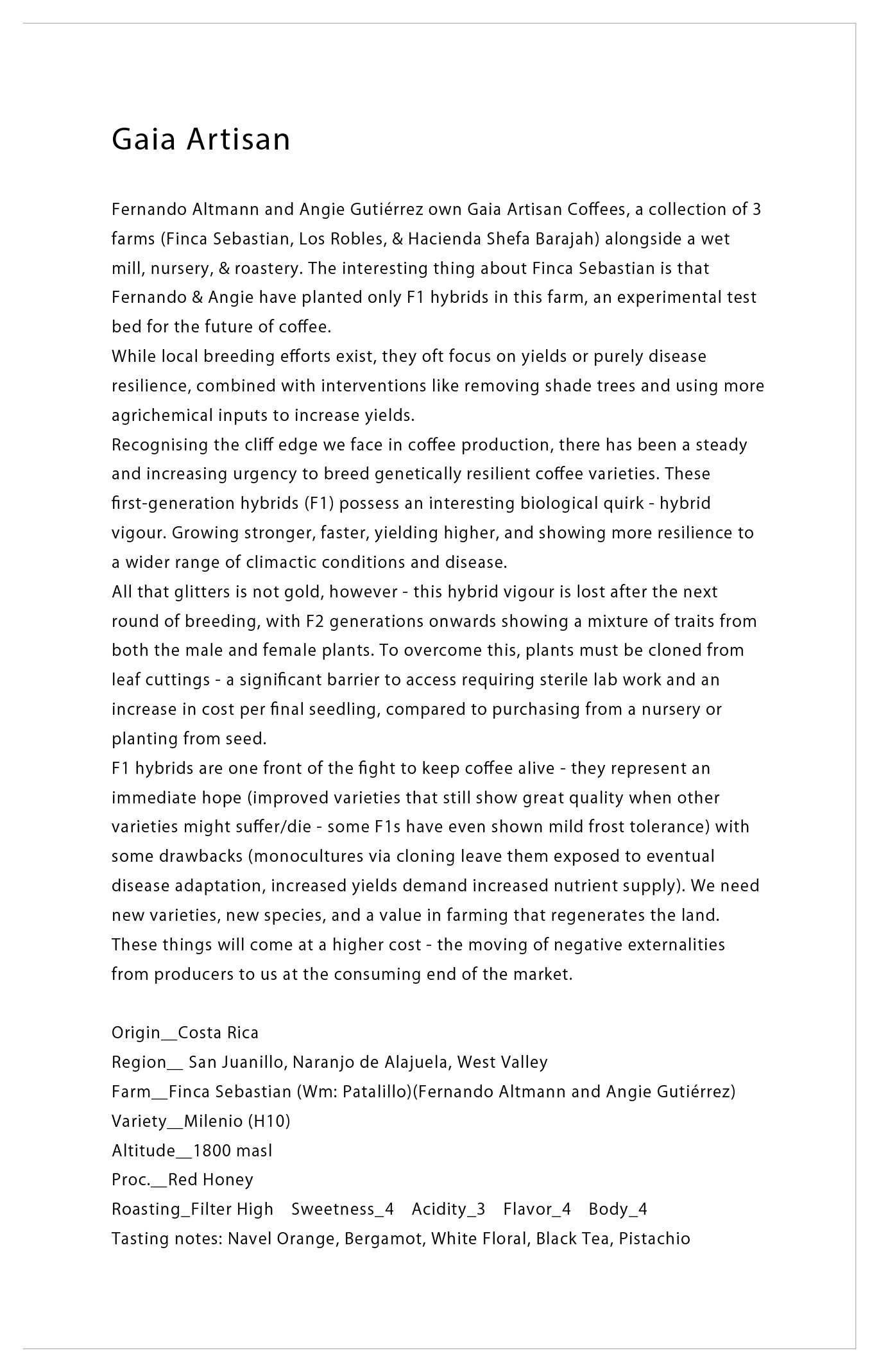 フェルナンド・アルトマン氏とアンジー・グティエレス氏は、精製所、苗圃、焙煎所とともに、3つの農場(フィンカ・セバスチャン、ロス・ロブレス、ハシエンダ・シェファ・バラハ)のコレクションであるGaia Artisan Coffeesを経営しています。フィンカ・セバスチャンの興味深い点は、フェルナンド氏とアンジー氏がこの農場にハイブリッド種のみを植えたことです。これは、コーヒー栽培の未来に関わる実験的な取り組みでした。